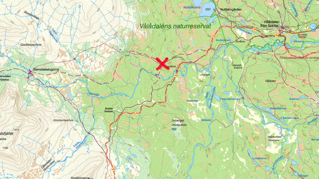 Vi finns drygt 6 kilometers skidåkning väster om Vålådalen, vid det röda krysset på kartan.